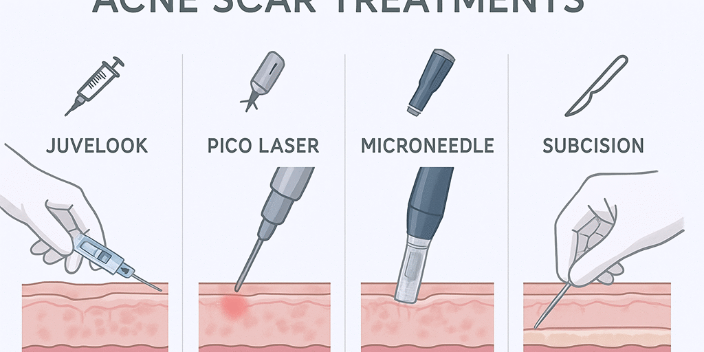 เปรียบเทียบการรักษาหลุมสิวด้วย Juvelook, Pico Laser, Microneedle และ Subcision วิเคราะห์ข้อดี ข้อเสีย ระยะฟื้นฟูและผลข้างเคียง เพื่อช่วยให้คุณตัดสินใจเลือกวิธีที่เหมาะที่สุดกับผิว